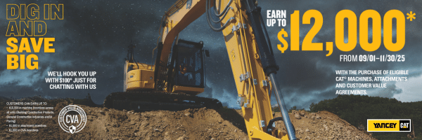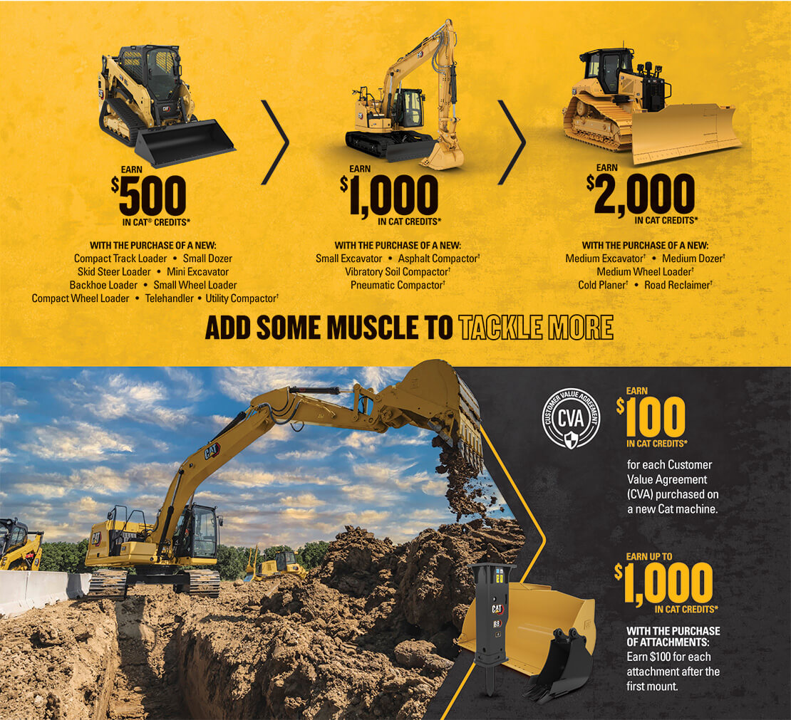 *In Cat Credits. Customers are limited to $10,000 in machine incentives across all units with $1,000 in CVA incentives. These offers are valid September 1 – November 30, 2025 and are subject to additional terms and conditions. Please visit http://cat.com/catcredits for more information.